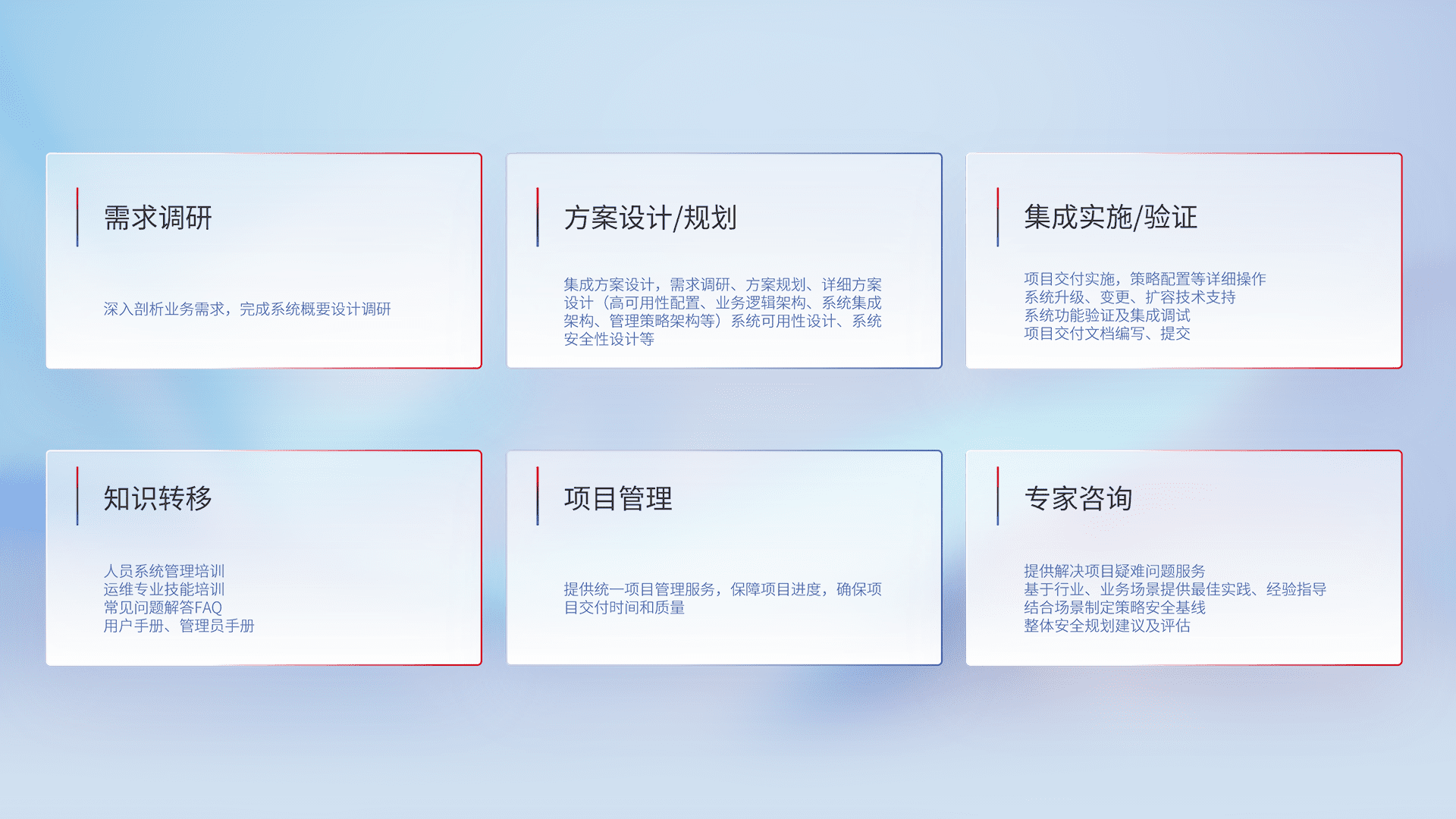 针对客户行业特性,,,,将宏观的安全战略和需求,,,,通过专业的交付服务,,,,实现项目落地,,为客户提供标准规范的集成交付服务。。。